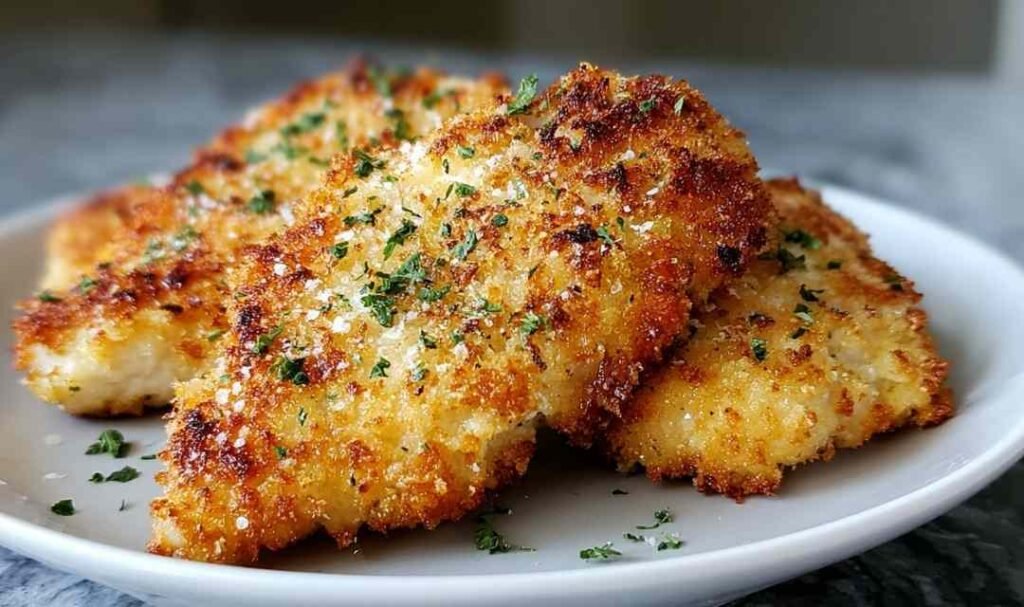 - 2 large boneless skinless chicken breasts (sliced horizontally into 4 cutlets) – I recommend patting them completely dry before breading for maximum crunch
