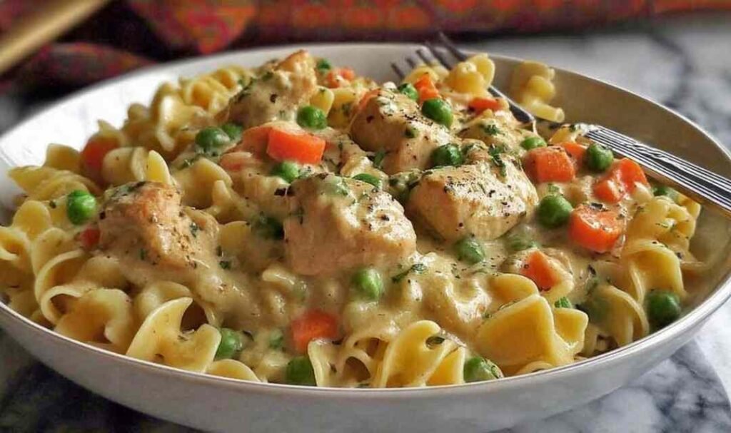 Chicken Pot Pie Pasta is everything you love about classic chicken pot pie but without the crust work, the long bake time, or the complicated steps. Creamy sauce, tender chicken, soft vegetables, and hearty egg noodles all come together in one skillet in about 40 minutes. I started making this on cold weeknights when my family wanted comfort food fast, and it quickly became one of the most requested dinners in our house.