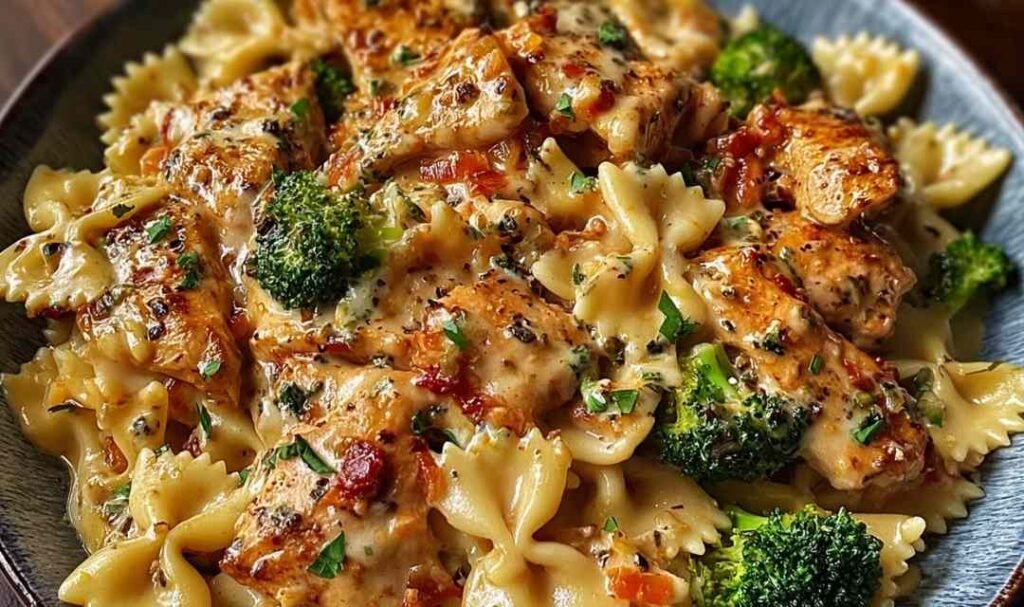 Step 4: Return the chicken, pasta, and broccoli to the skillet. Toss everything together until evenly coated in the sauce. Add splashes of reserved pasta water a little at a time until the sauce reaches a silky consistency. Stir in the Parmesan cheese and let it melt fully into the dish.