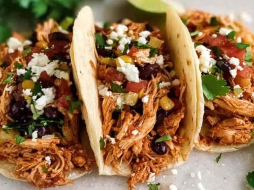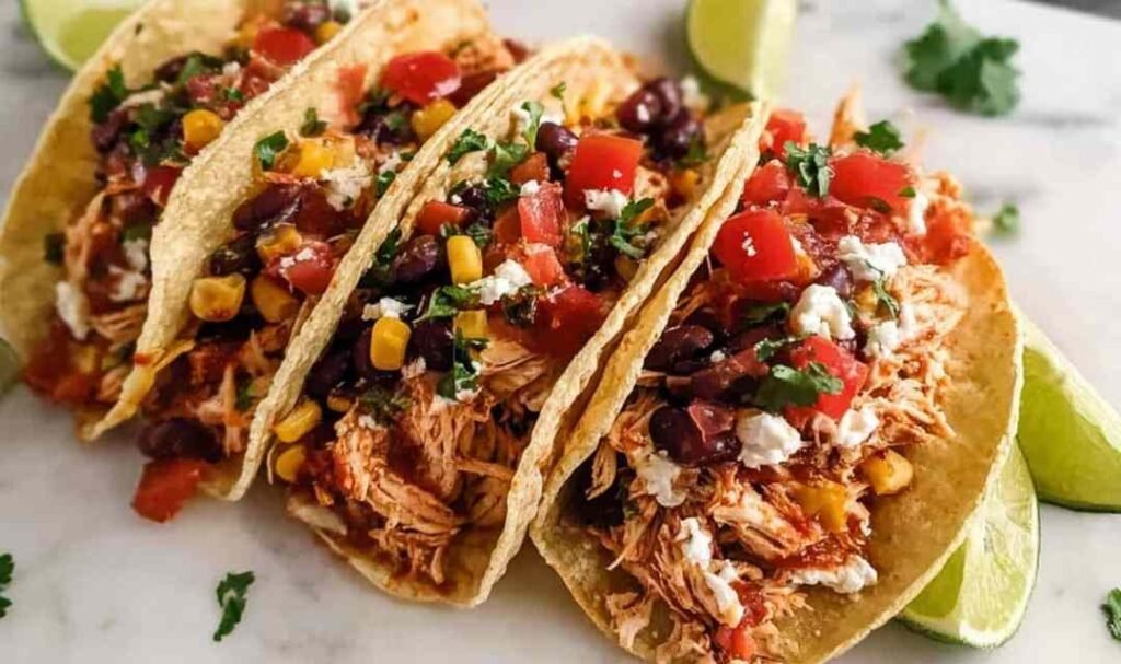 Tender slow-cooked shredded chicken with salsa, black beans, corn, and bold taco spices — all piled into warm flour tortillas for an easy weeknight dinner.