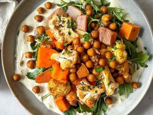 Store roasted vegetables and tahini yogurt sauce separately in the refrigerator for up to 4 to 5 days. Store roasted chickpeas at room temperature in a loosely covered container for up to 7 days to maintain crispiness. For a spicy version, add red pepper flakes or cayenne to the spice blend. Add shredded chicken, salmon, or tofu for extra protein. Use plant-based yogurt to make the recipe fully vegan.