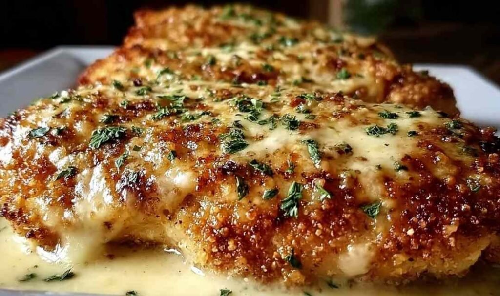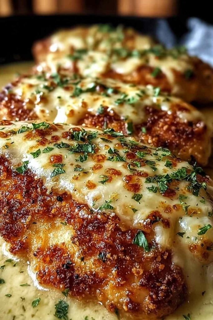 Crispy breaded chicken breasts topped with a melted Parmesan and mozzarella cheese blend, pan-seared golden then baked to perfection.
