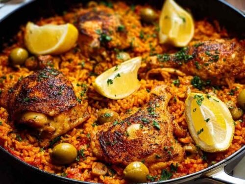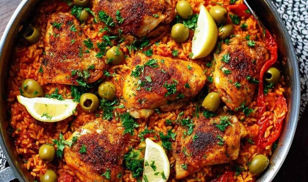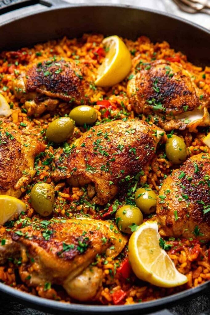 One pan Spanish chicken and rice with smoky paprika chicken thighs, tomato rice, green olives, and lemon wedges in a large skillet