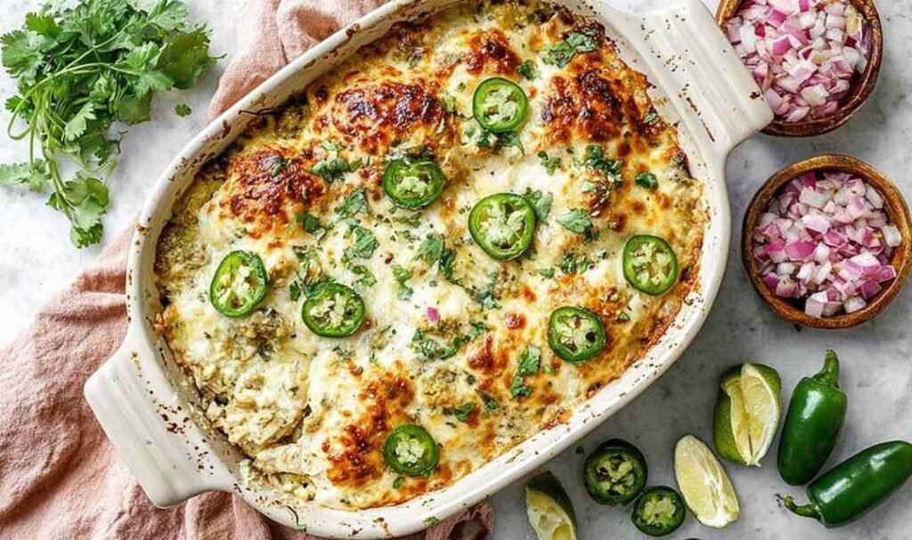 Step 9: Bake uncovered for 15 to 20 minutes, until the cheese is fully melted and the sauce is visibly bubbling around the edges of the dish. The top should look golden and set. Let the casserole rest for 5 minutes before cutting and serving. This rest time helps the layers hold their shape. Garnish with cilantro, cotija cheese, jalapenos, and diced red onion.