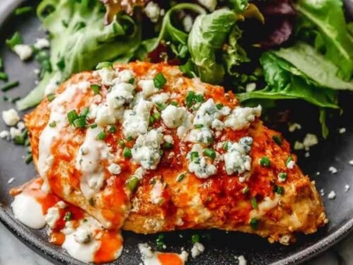Juicy boneless chicken breasts stuffed with a creamy blend of cream cheese, cheddar, and ranch, seared golden in a skillet, and simmered in bold Buffalo sauce until cooked through.